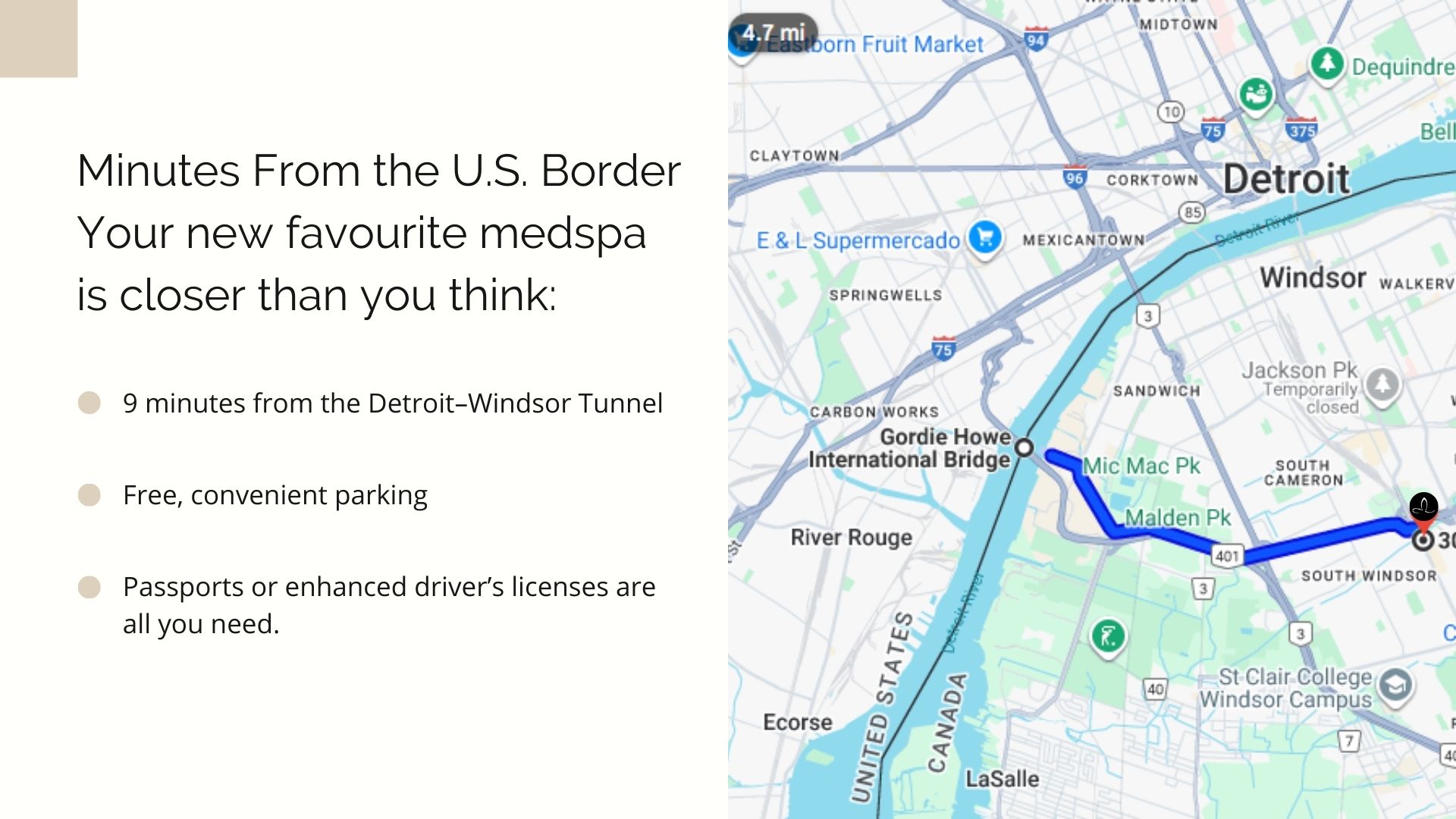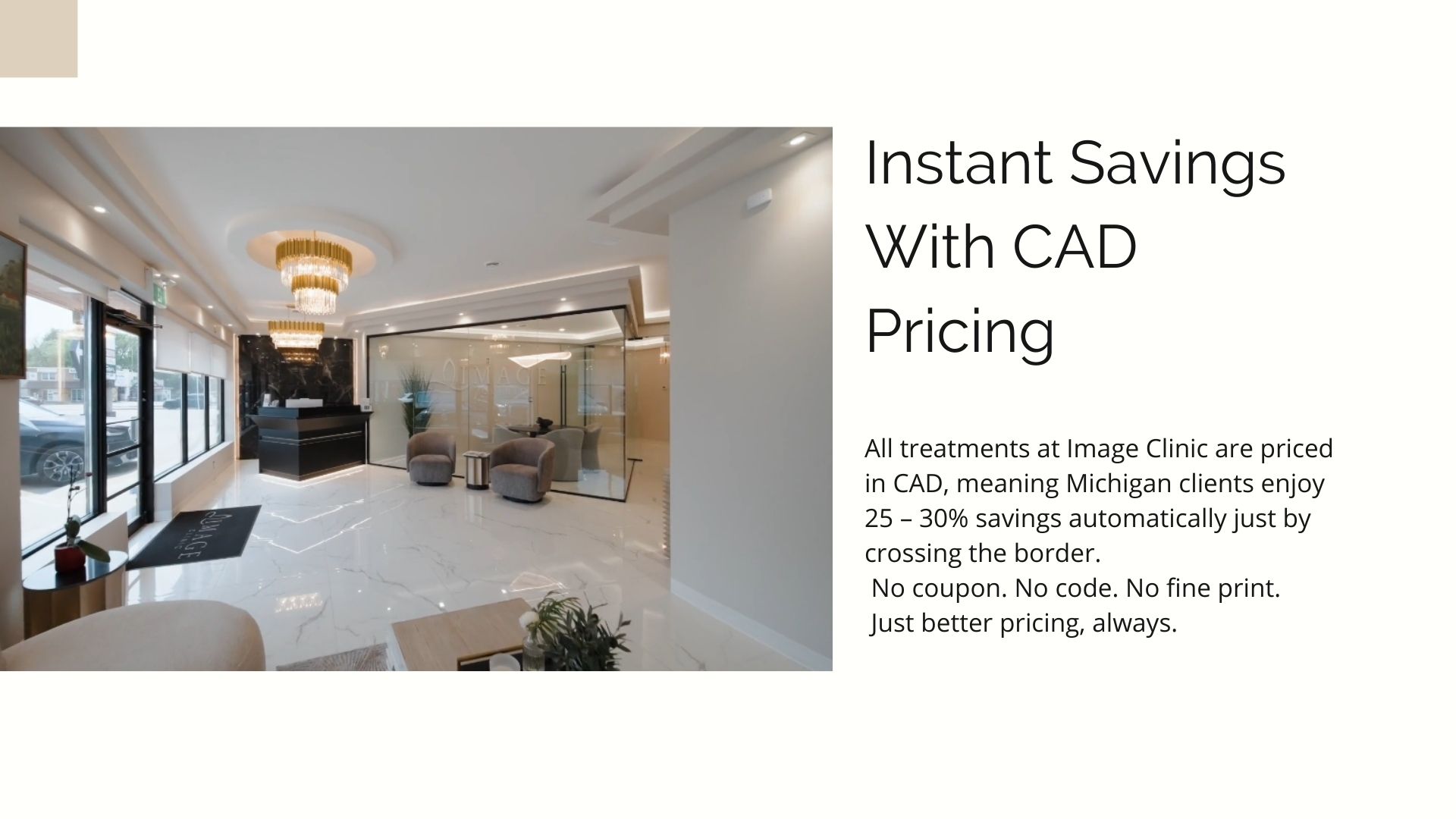 Image Clinic is located just 10 minutes from the Detroit Windsor Tunnel, offering U.S. clients luxury medical aesthetics, expert injectors, and immediate savings thanks to the Canadian dollar.